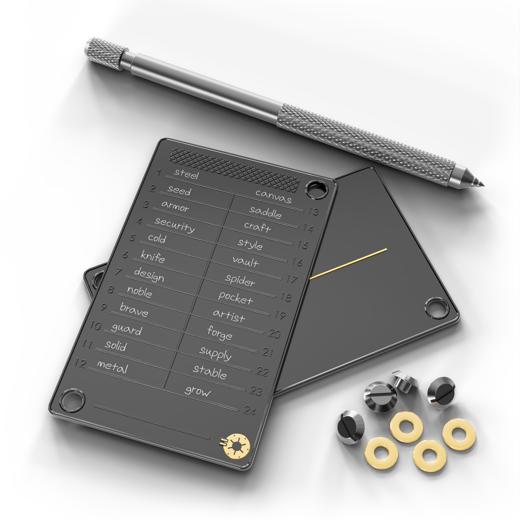 Protect your recovery words with the Black Seed Ink Premium Seed Phrase Wallet, a thick, heavy 304 grade stainless steel plate stack built for serious cold storage. Use it to back up Bitcoin Improvement Proposal (BIP) 32, BIP39, BIP44 compatible hardware wallets (Ledger, Trezor, etc.) and hot wallets (MetaMask, Coinbase Wallet, etc.). Designed to stay discreet, it features an anonymous layout, matte black finish with gold accents, and brass washers with a knurled grip so you can hold the stack steady and engrave deep.